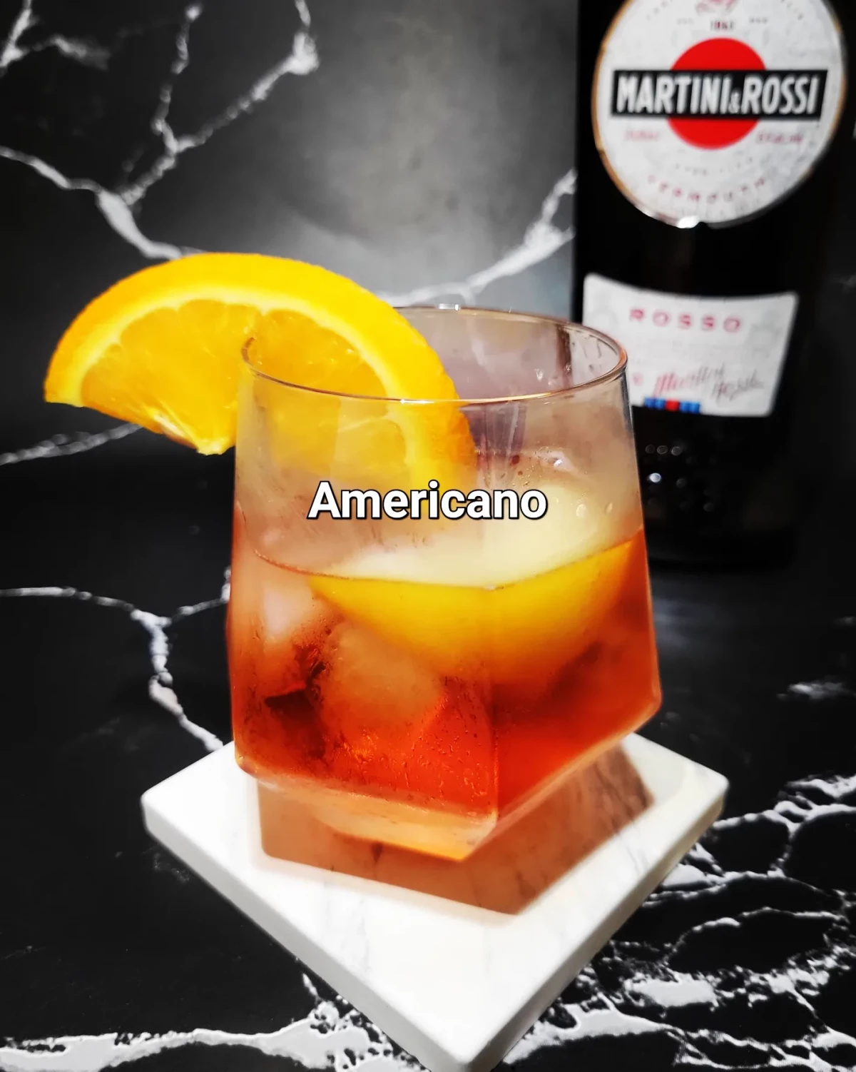 The americano is an IBA official cocktail composed of campari, sweet vermouth, and for the sparkling version, club soda and garnished with a slice of lemon.