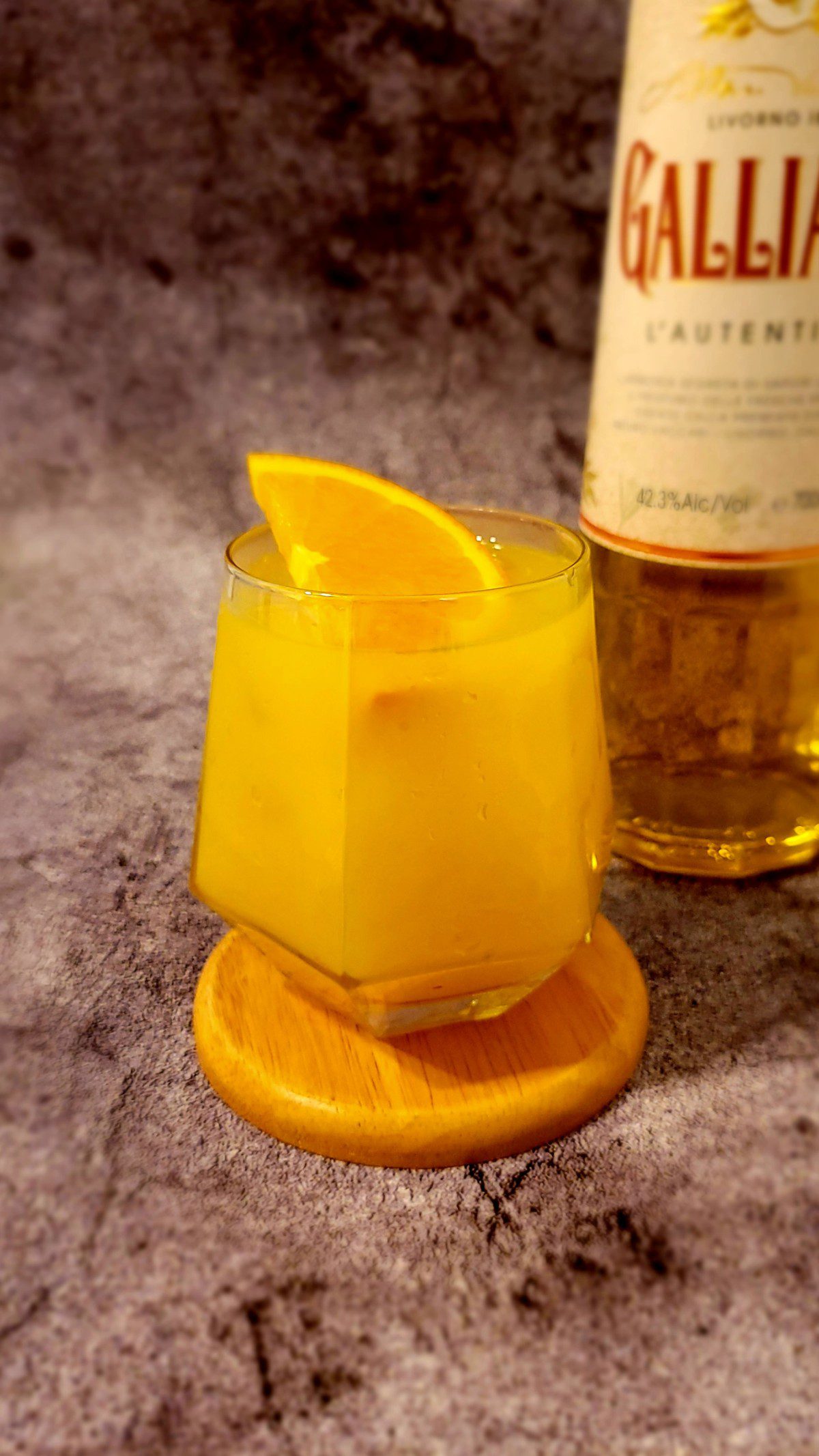 Stir the vodka and orange juice with ice in the glass, then float the Galliano on top.