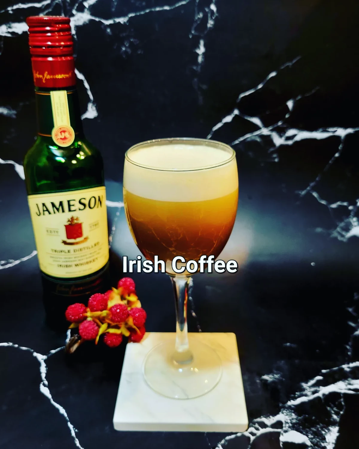 Irish coffee is a caffeinated alcoholic drink consisting of Irish whiskey, hot coffee, and sugar, stirred, and topped with cream.