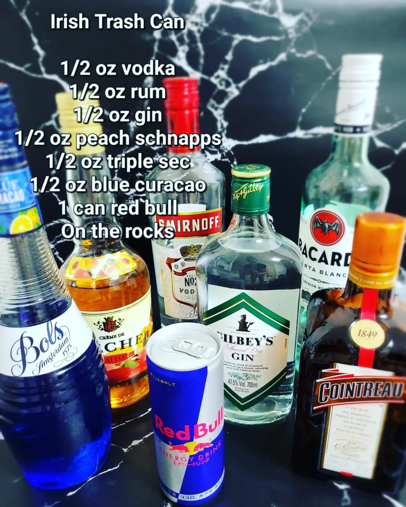 Irish Trash Can Gin, Liqueur, Rum, Vodka Recommended My Fair Lady Between the Sheets Blackthorn Bronx Tuxedo Orgasm 20th Century Skittle Bomb Monkey Gland U-Boot