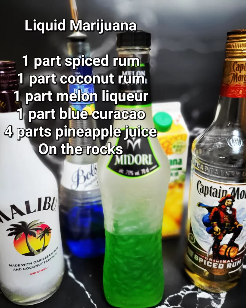 Liquid Marijuana Liqueur, Rum Recommended Piña colada Hoppel Poppel Dark ‘n’ Stormy Brass Monkey Caipirinha Prince of Wales Redhead Slut Tokyo Tea Sumatra Kula Red Russian