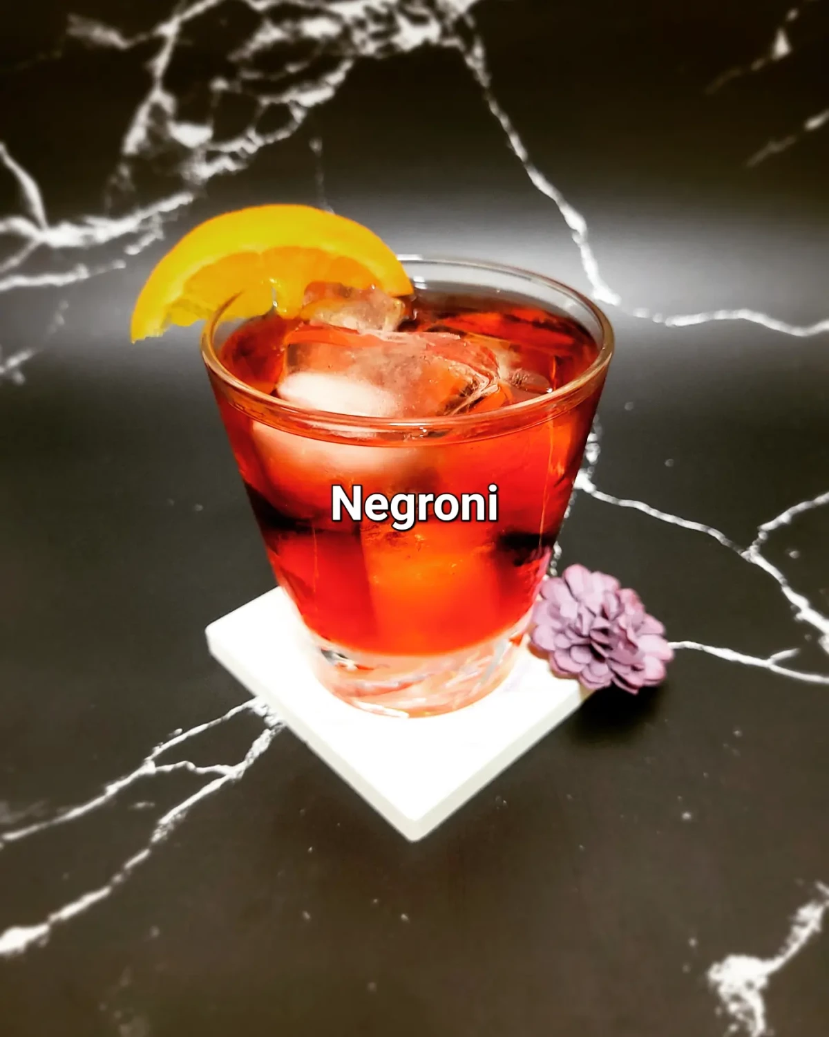 A Negroni is an Italian cocktail, made of one part gin, one part vermouth rosso and one part campari, garnished with orange peel.