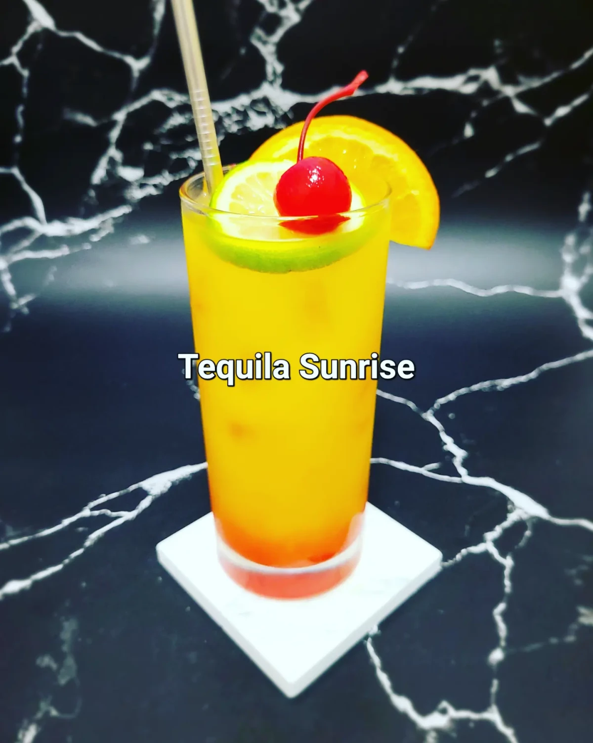 The cocktail is named for its appearance when served with gradations of color resembling a sunrise.